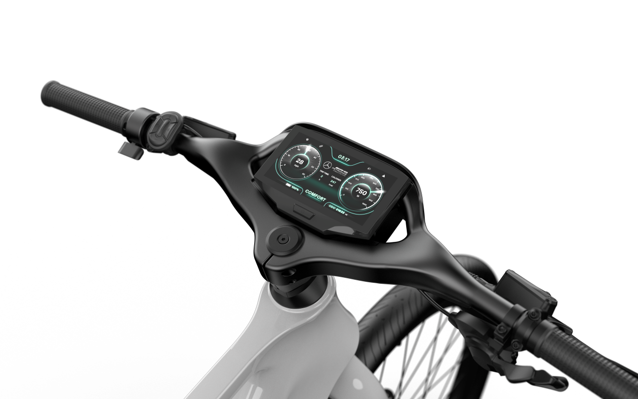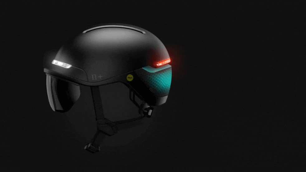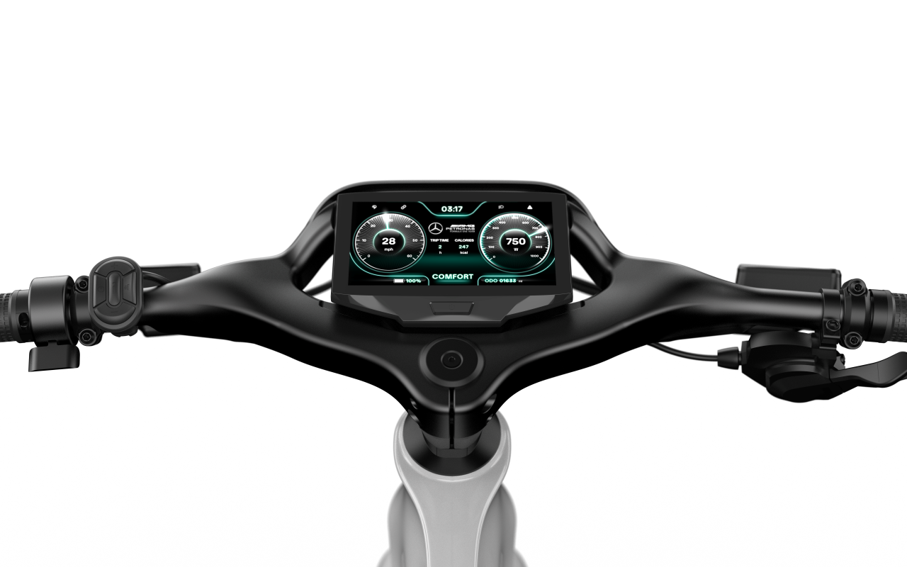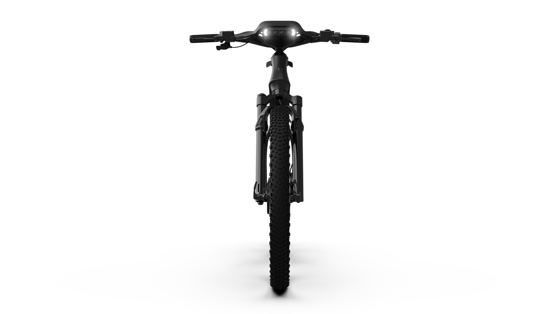 The bike's integrated LED head and tail lights sync automatically with the smart helmet’s head and tail lights.